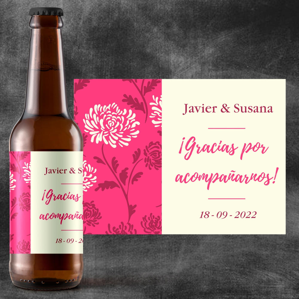 Una etiqueta con motivos florales en el panel izquierdo y con tu personalización en la parte derecha.